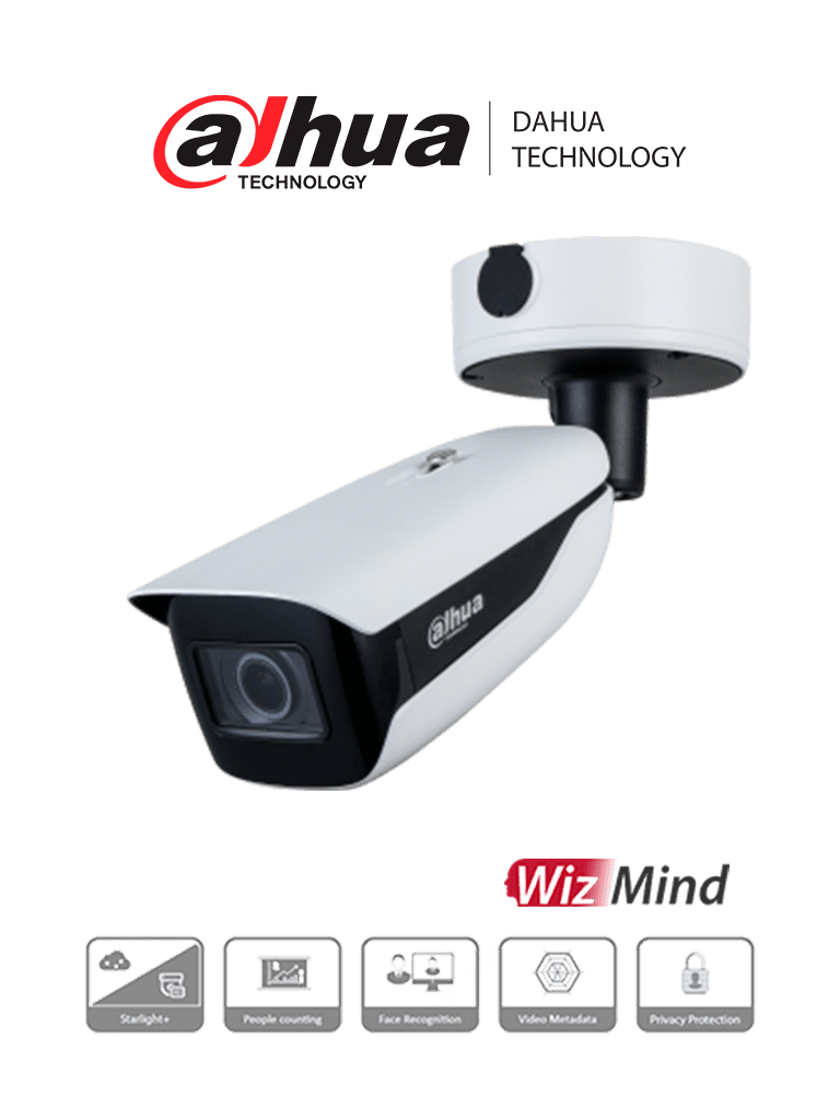 DAHUA IPC-HFW7442HN-ZFR - Cámara IP Bullet Resolución de 4 MP/ Lente Mot. 2.7 a 12mm/ ∢ 114°-47°/ IR 60 mts/ IA WizMind/ Reconocimiento Facial/ Metadatos de Video/ Conteo de Personas/ Starlight/ ePoE/ WDR 140dB/ H.265/ IP67/ IK10/ E&S Alarma/ E&S Audio/