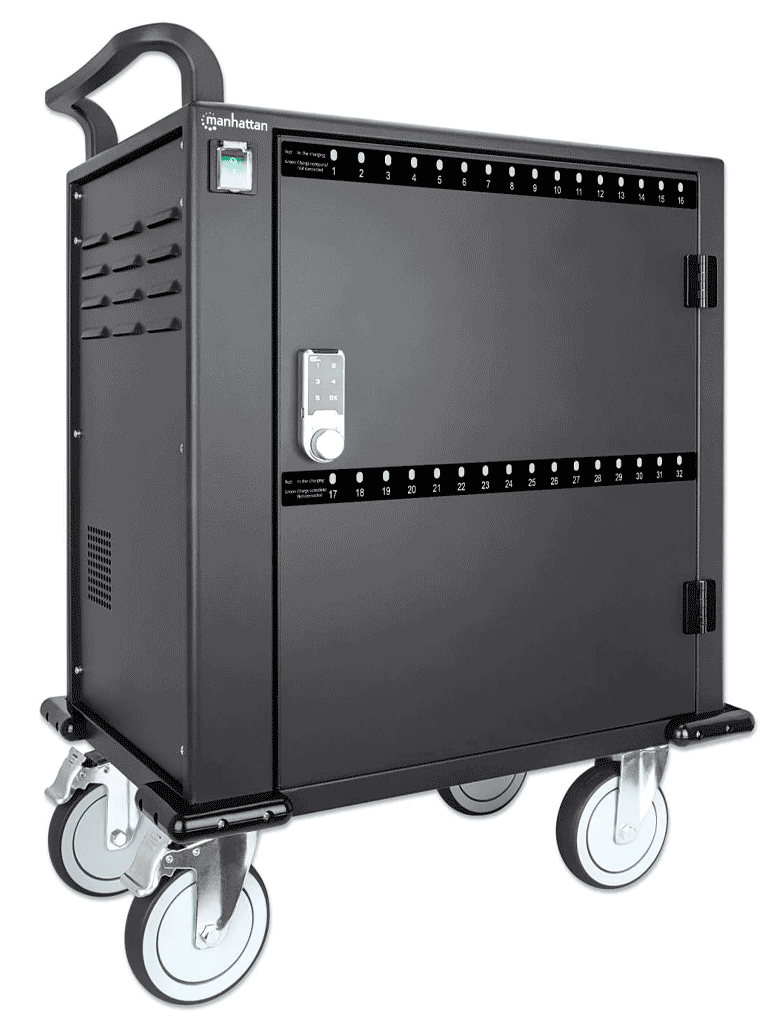 MANHATTAN - 716000 - Gabinete móvil carga profesional / 32 puertos, compartimientos espaciosos teléfonos y tabletas, 576 W total, 18 W por puerto, bloqueo código PIN, protección sobretensiones, ventilación silenciosa, carcasa metal, negro PROMOMAYO