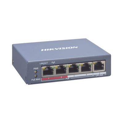 Switch Monitoreable PoE+ / 4 puertos 100 Mbps PoE+ / 1 Puerto 100 Mbps Uplink / PoE hasta 250 Metros / 60 Watts / Conexión Remota desde Hik-PartnerPro
