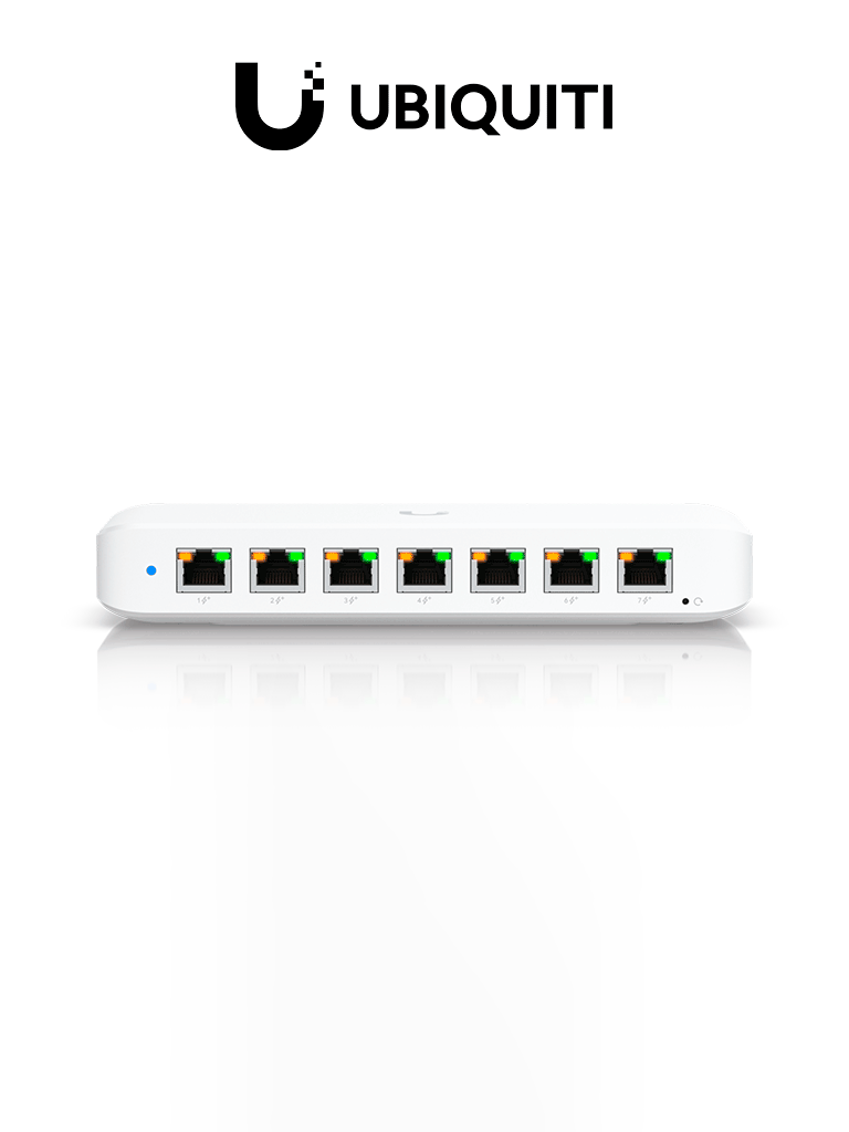 Con 8 puertos Gigabit Ethernet, de los cuales 7 ofrecen PoE+ para alimentar cámaras IP, puntos de acceso UniFi o teléfonos VoIP, el USW-Ultra permite reducir la cantidad de adaptadores y fuentes externas, centralizando la distribución de datos y energía.